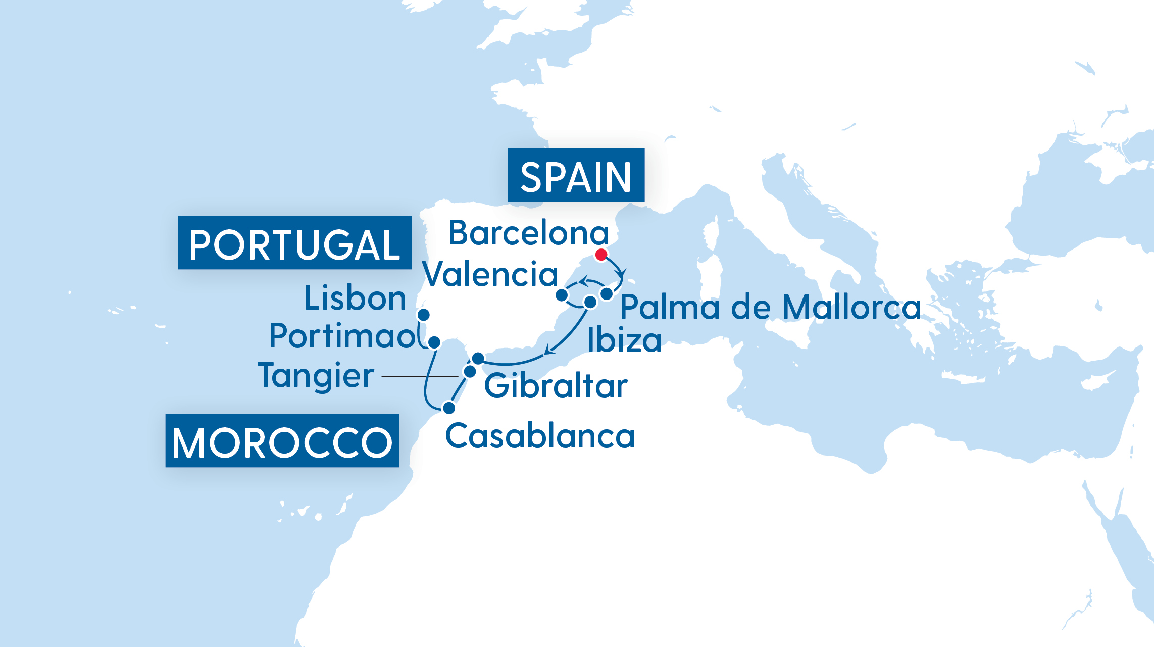 Highlights: Barcelona | Palma de Mallorca | Valencia | Ibiza | Gibraltar | Tangier | Casablanca | Portimao | Lisbon