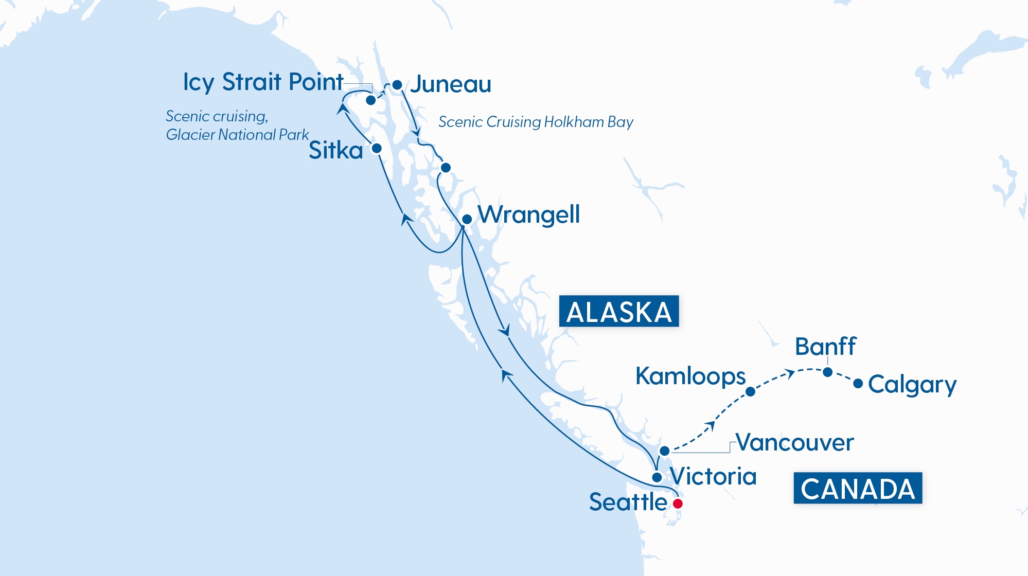 From the energy of Seattle to the serene embrace of Alaska’s untamed wilderness, this journey unfolds like a story written across sea and sky. Days drift between open waters and charming frontier townsm - Ketchikan, Sitka, Juneau - each a window into the soul of the Last Frontier. Glaciers shimmer in Holkham Bay, while quiet Wrangell whispers of history and nature intertwined.